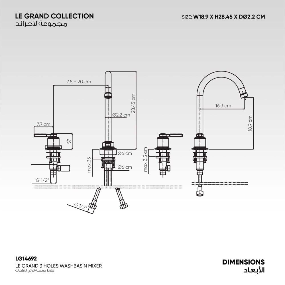 - المسافة بين منتصف الصباب ومنتصف ذراع التحكم من 7.5 الى 20 سم