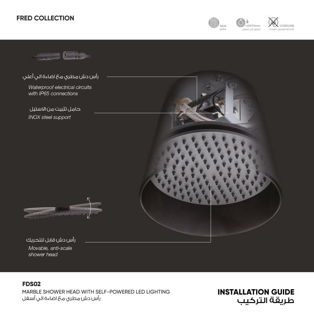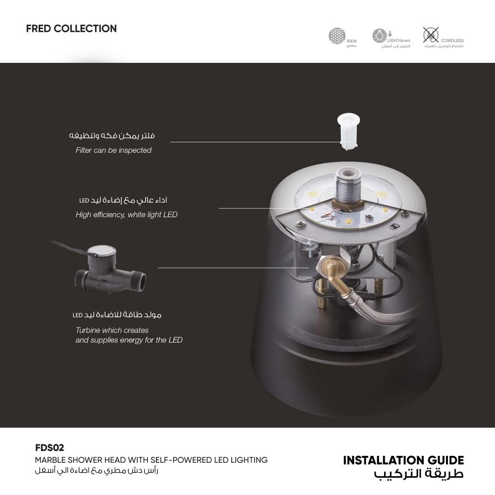 - يتكون من راس دش مع اضاءة (ليد)مدمجة و ذاتية التشغيل، لا تحتاج للكهرباء وصديقة للبيئة