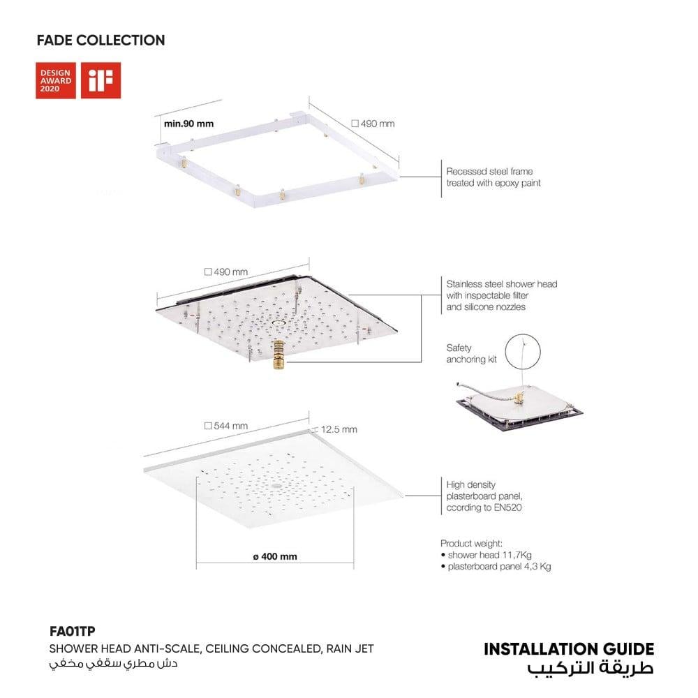 For a water pressure higher than 3 bar, it is recommended to install a pressure reducer on the water network, and it is recommended to install water filters before installing the shower system, and it is also recommended to clean the water pipes before installation.