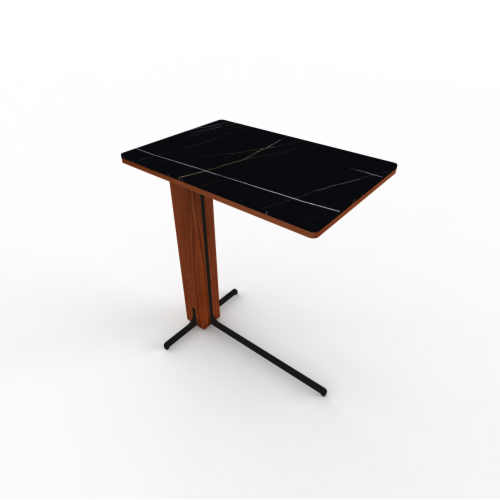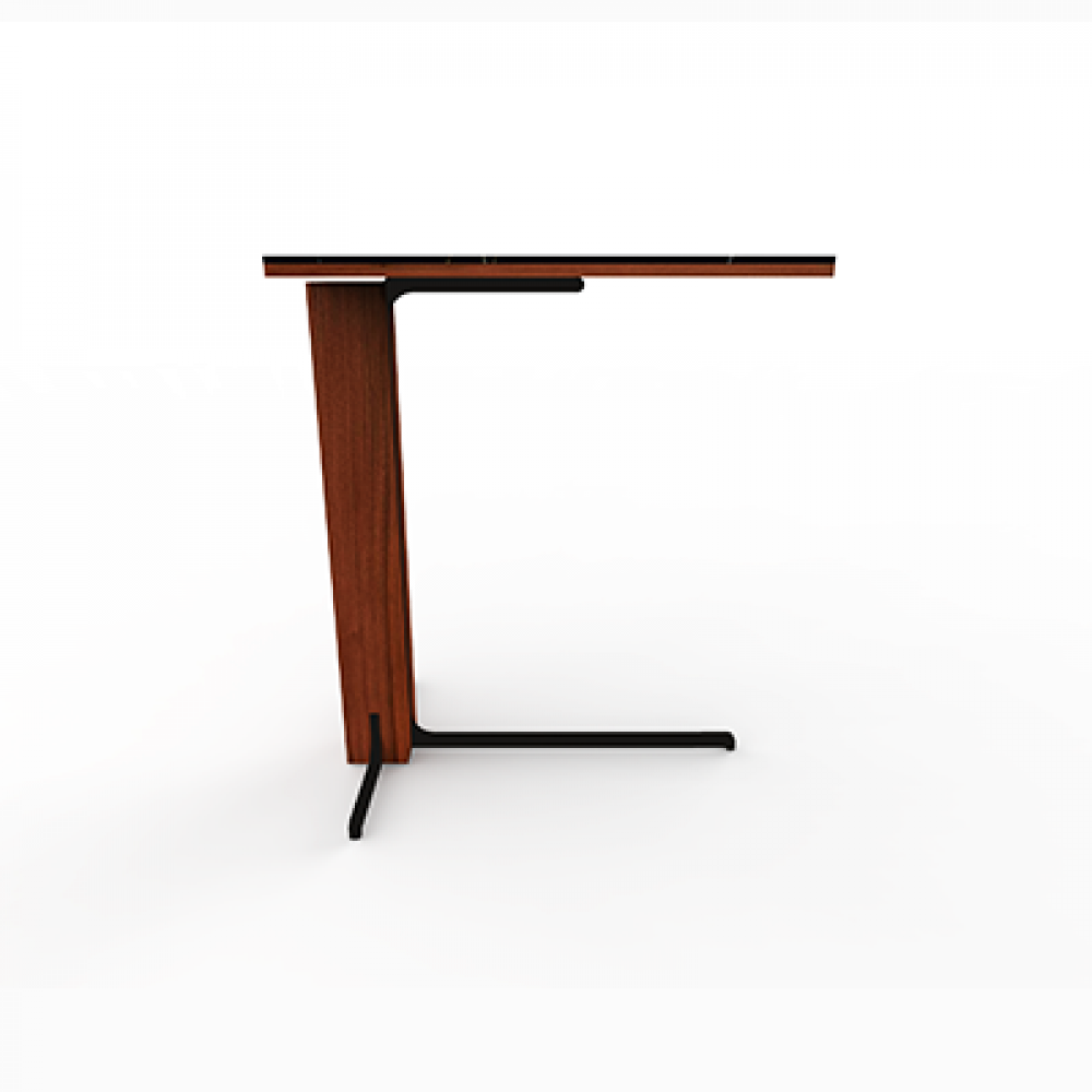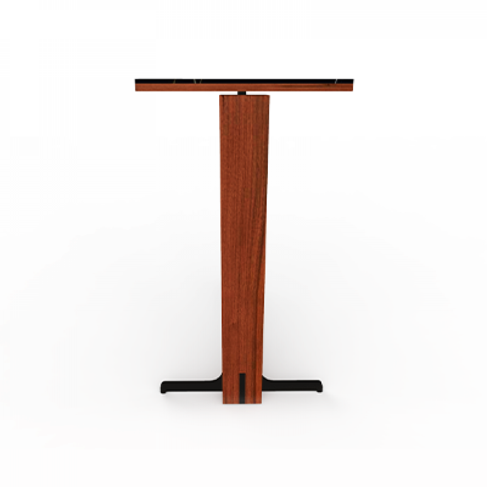 Service table (H6T): table with removable service plate in single Mahogany wood base and legs rests on T-shape steel base with natural finish.Flat spanish porcelain surface top with high-resistance and thickness of 6mm