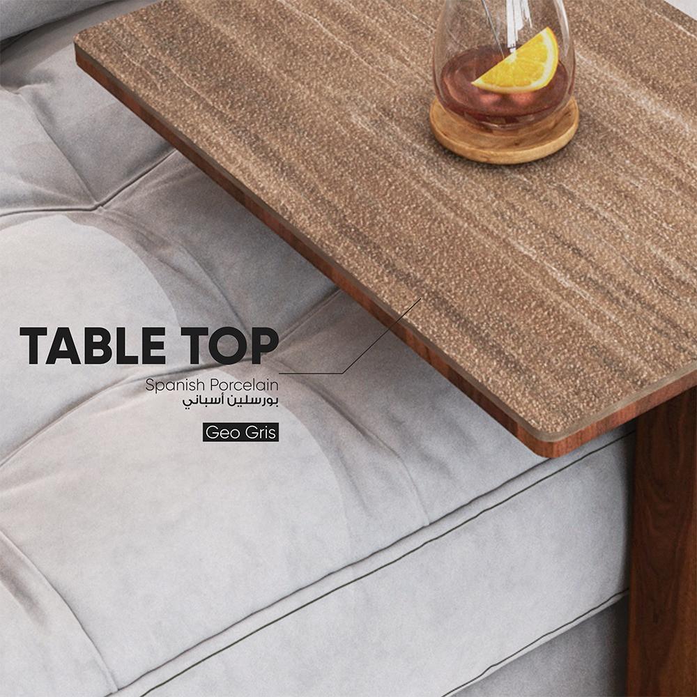 ذات سطح رفيع متحرك من البورسلين الأسباني يُقدر بسماكة 6ملم و أرجل من الفولاذ وخشب الماهوجني الخام.
