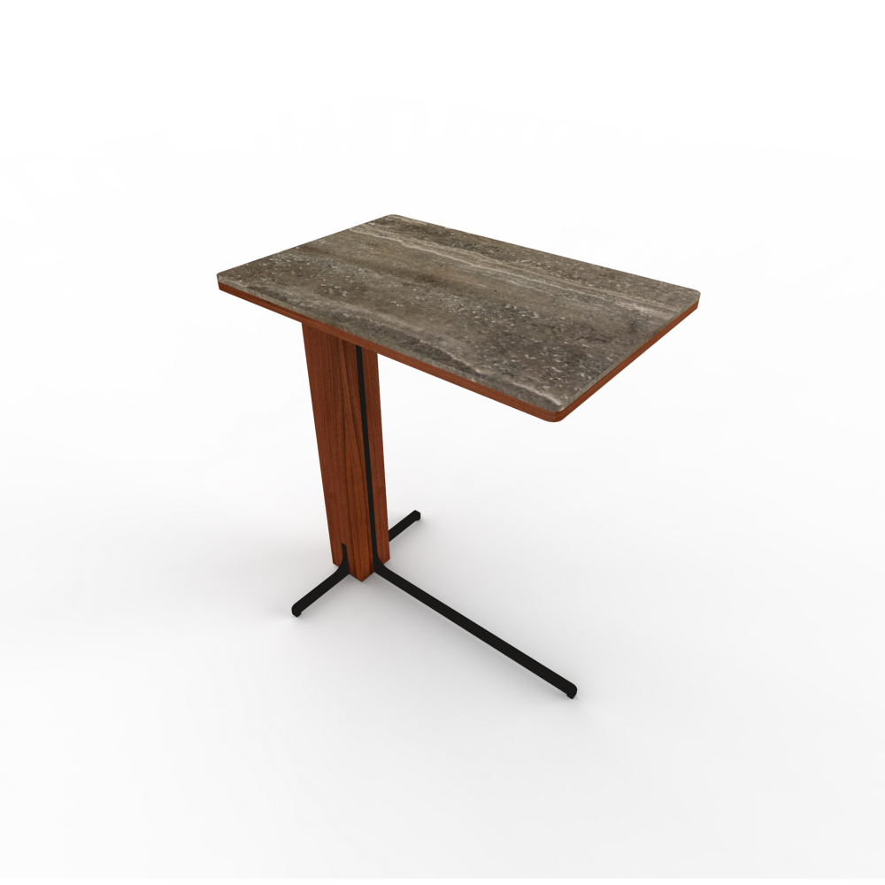 Service table (H6T): table with removable service plate in single Mahogany wood base and legs rests on T-shape steel base with natural finish.Flat spanish porcelain surface top with high-resistance and thickness of 6mm