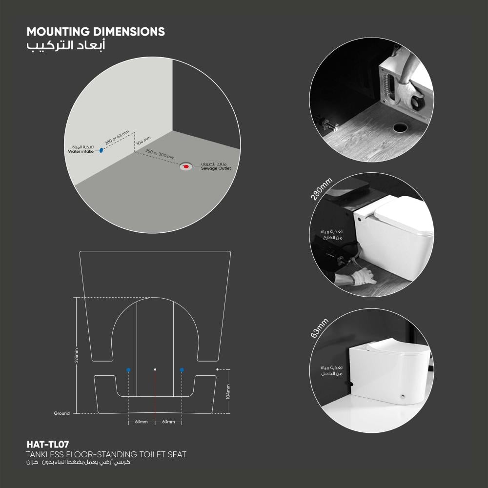 نمط الصرف الصحي: أرضي S-Trap, 25 سم أو أرضي S-Trap, 30 سم