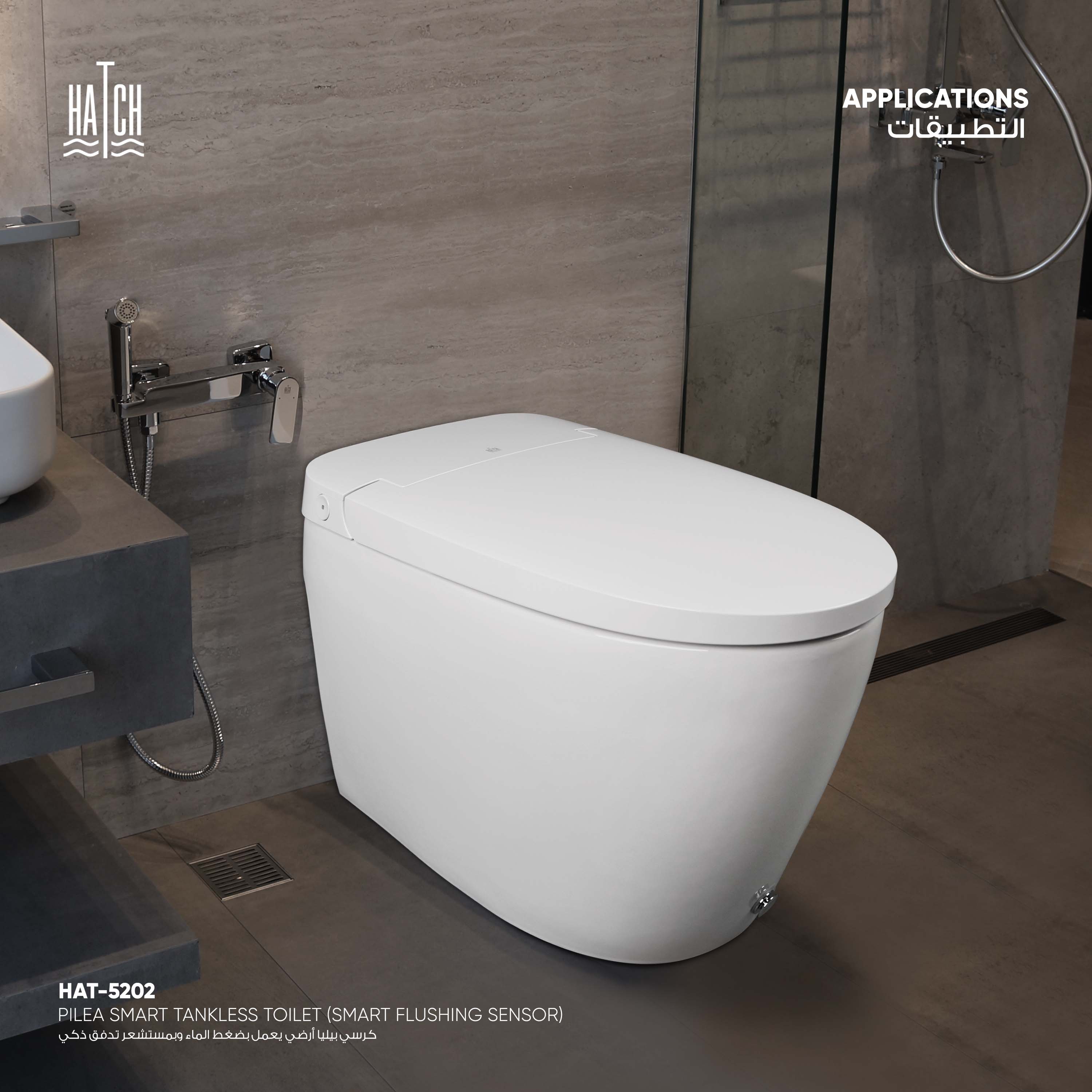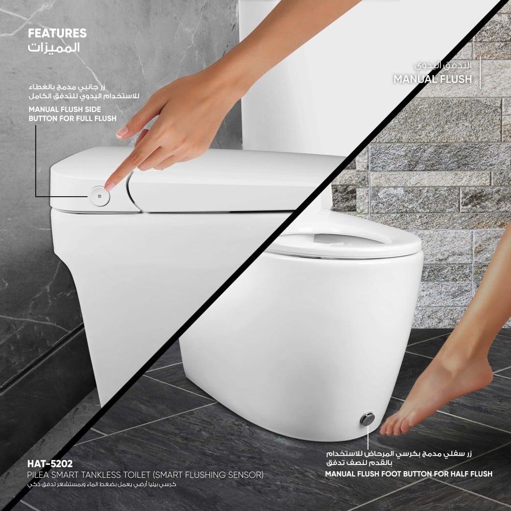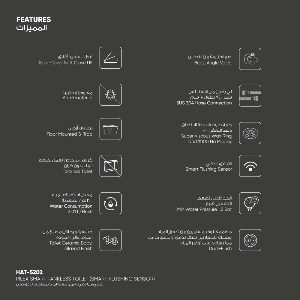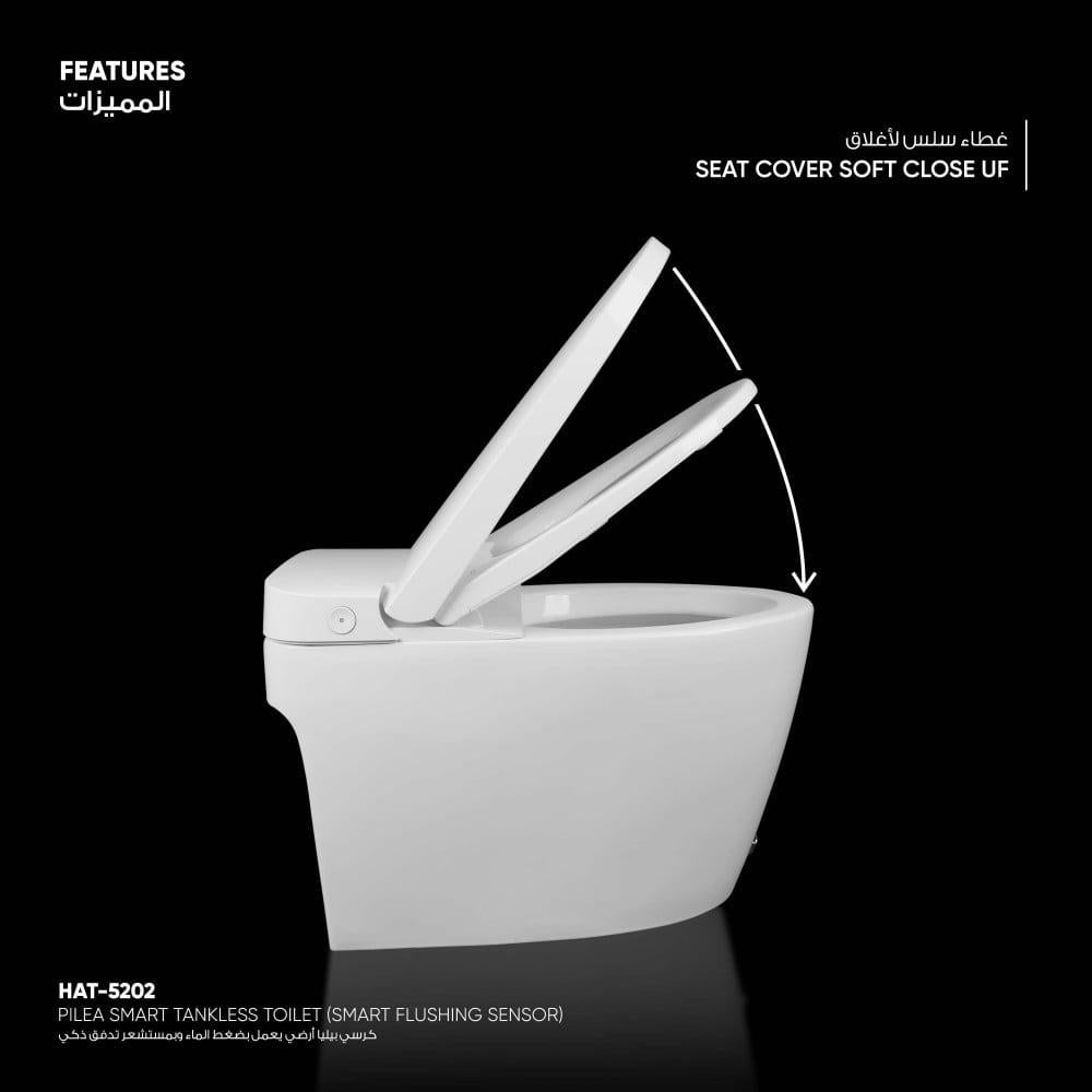 - غطاء من PP مريح وسلس الأغلاق مزود بمستشعر حركة لتدفق ذكي ، وزر جانبي للتدفق اليدوي