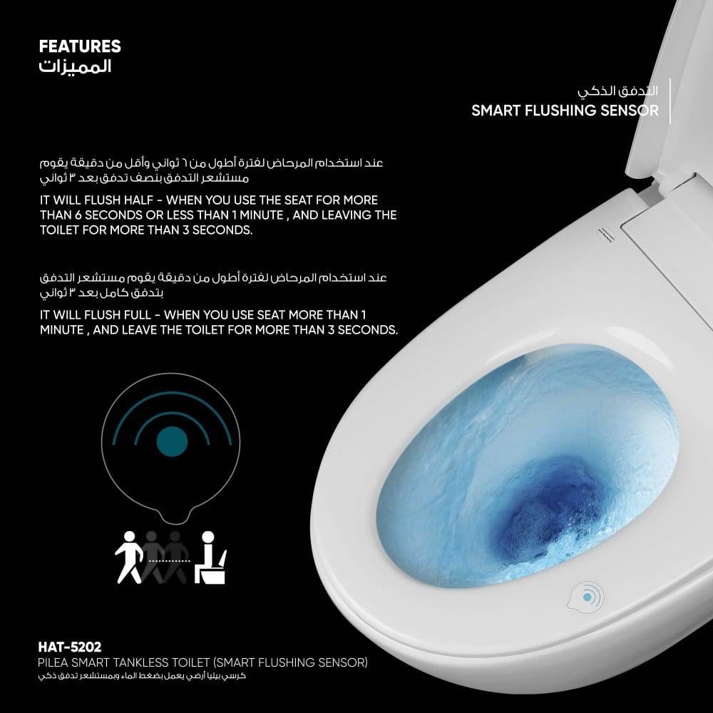 - عند استخدام المرحاض لفترة أكثر من دقيقة يقوم مستشعر التدفق بتدفق كامل بعد 3 ثواني