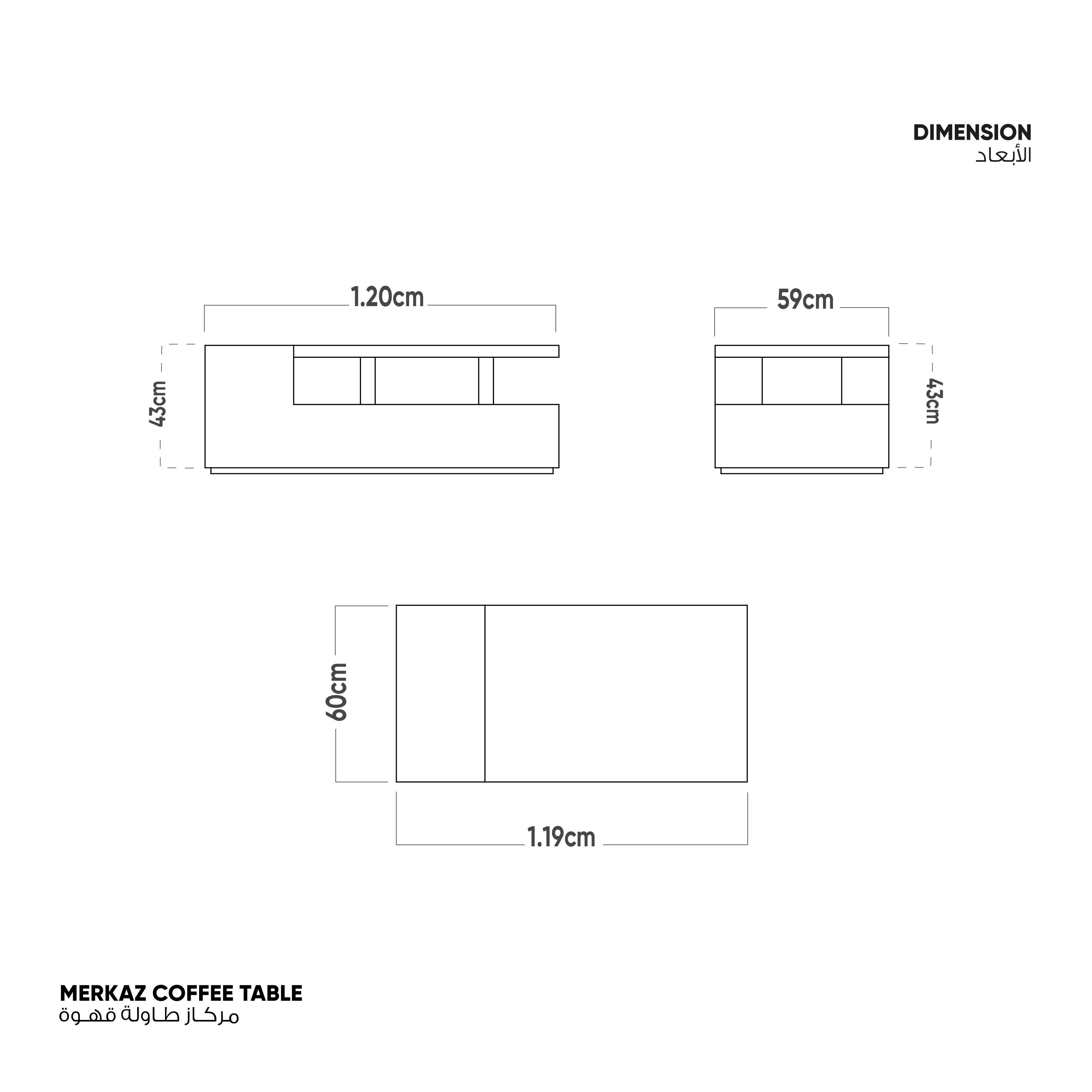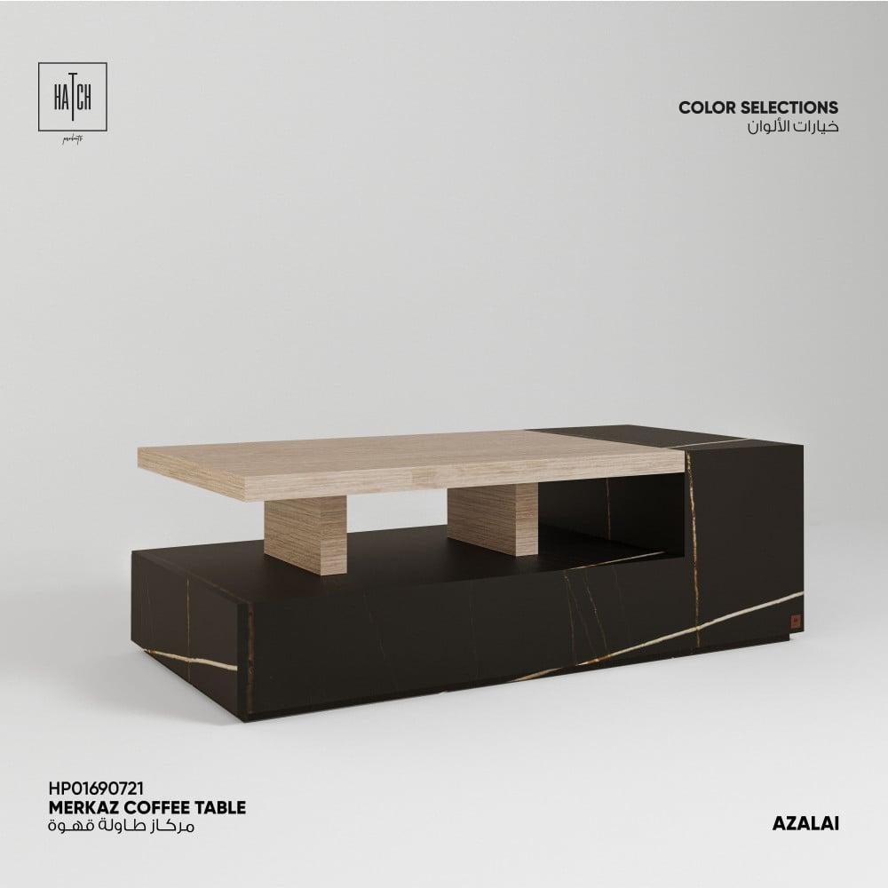 طاولة قهوة تمزج ألوان البورسلان الإسباني مع البورسلان الخشبي بتصميم أنيق حيث أن السطح مرتكز على القاعدة ليكون مساحة استخدام علوية ومساحات تخزين جانبية مكشوفة.