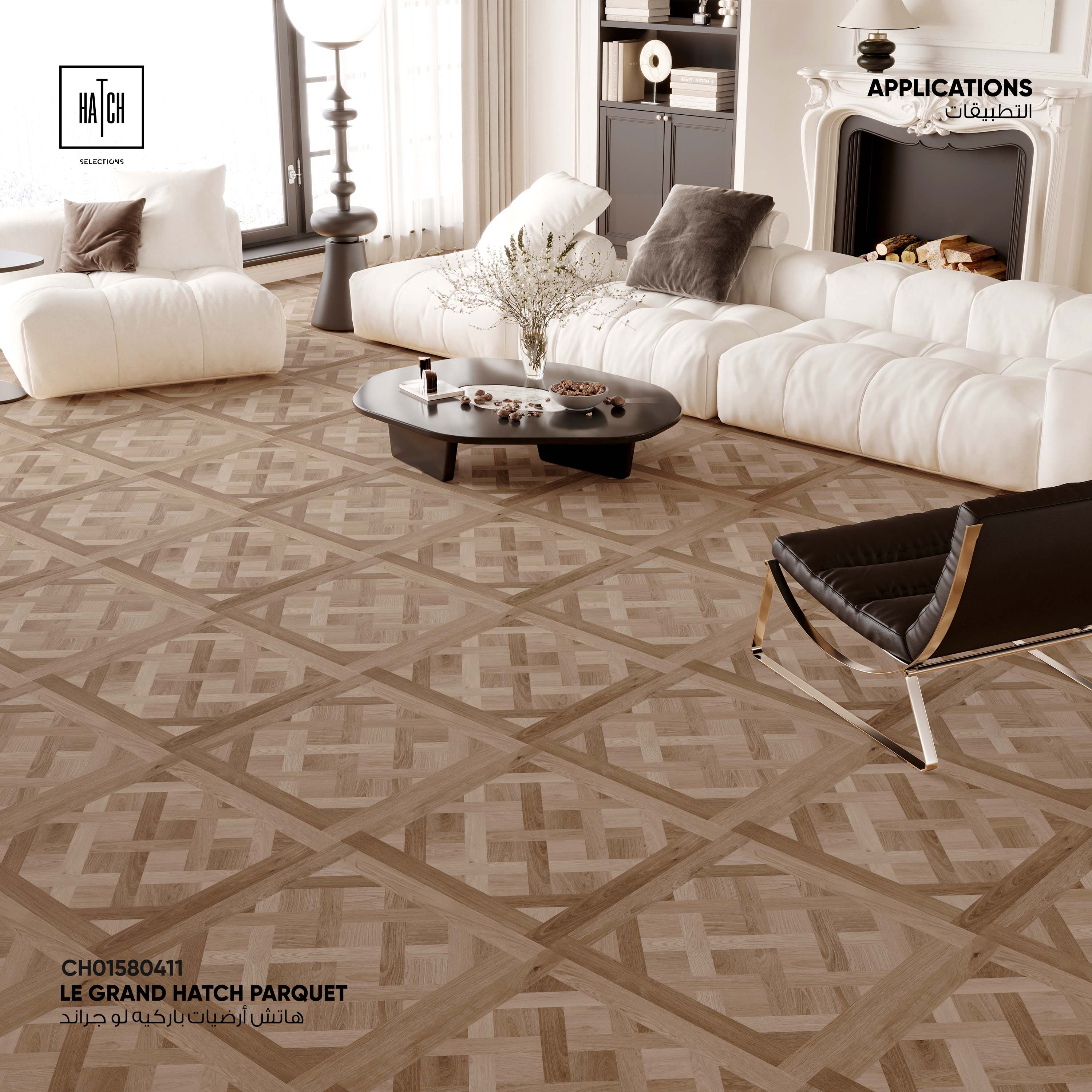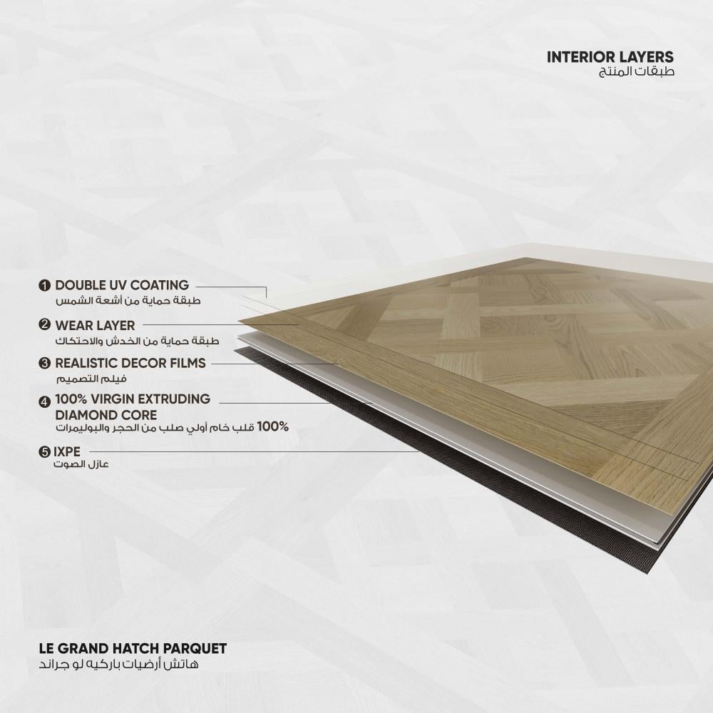 أرضيات (هاتش لو جراند من مادة الـ SPC )مادة أرضيات فاخرة تجمع بين الجمال والعملية. تتميز بمقاومة ممتازة للتآكل، ومقاومة للماء، ومقاومة للخدش، مع توفير أنماط خشبية وحجرية واقعية من خلال تقنية الطباعة عالية الدقة
