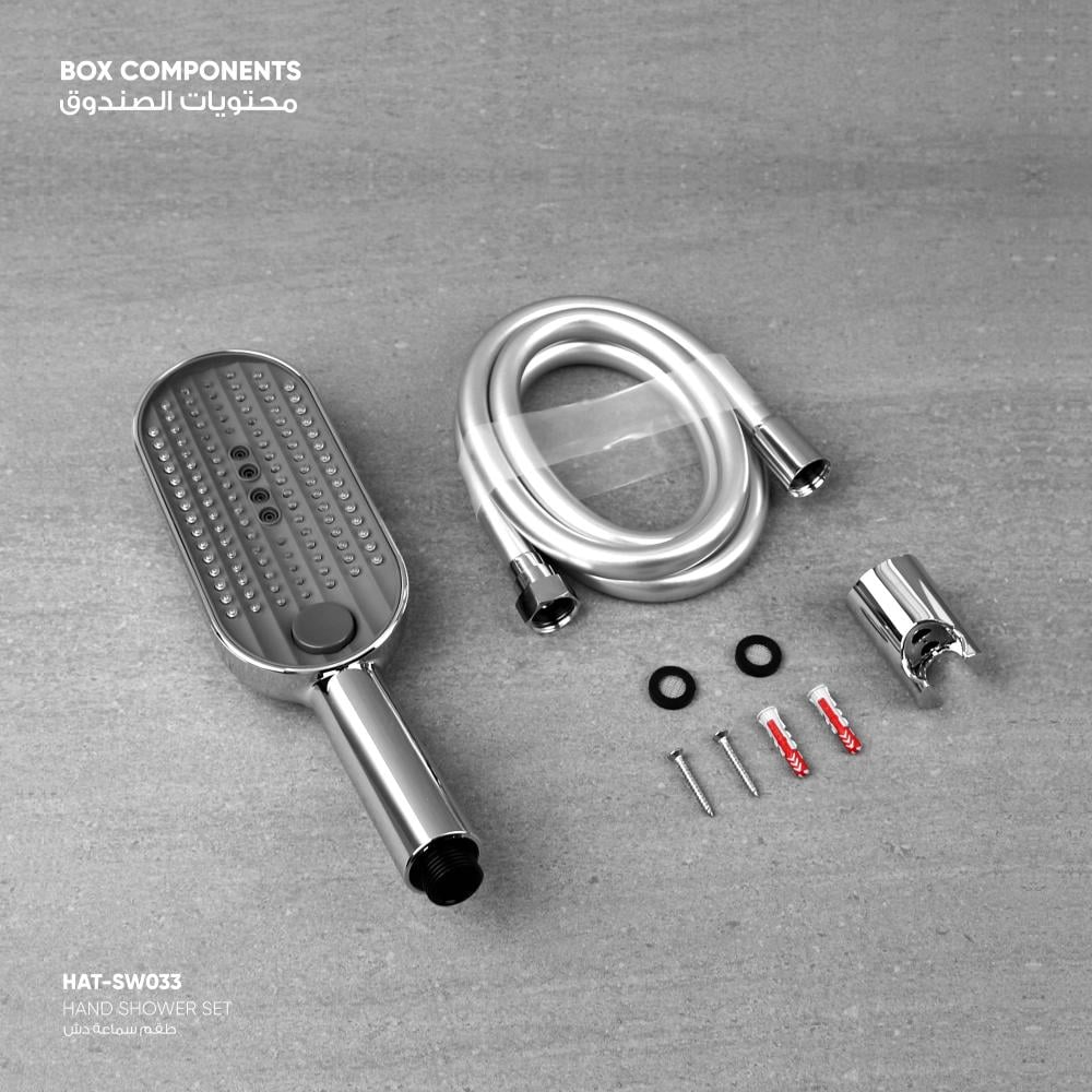 سماعه دش+ هوز بطول 150 سم + حامل بلاستيك+ فلتر منظم لتدفق المياه+ طقم مسامير التثبيت + براغي فيشر + 2 فلتر مرشح + دليل التركيب