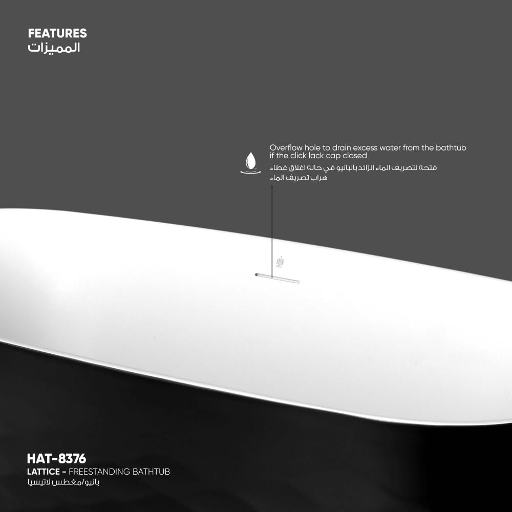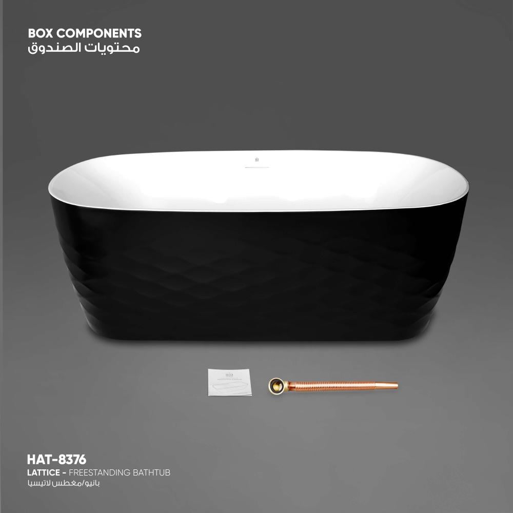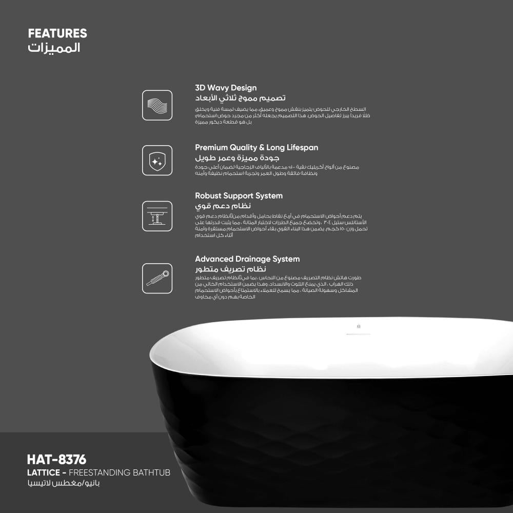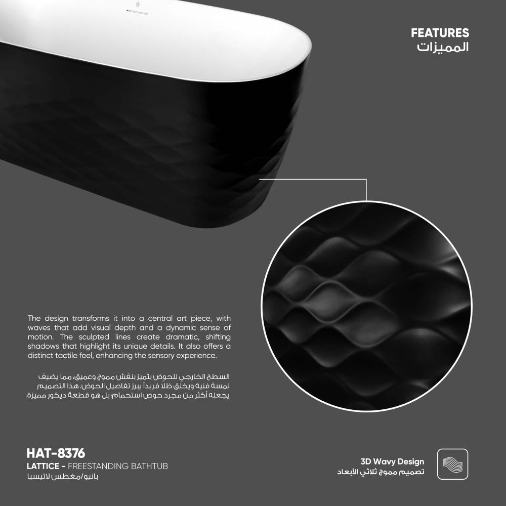 السطح الخارجي للحوض يتميز بنقش مموج وعميق، مما يضيف لمسة فنية ويخلق ظلاً فريداً يبرز تفاصيل الحوض. هذا التصميم يجعله أكثر من مجرد حوض استحمام؛ بل هو قطعة ديكور مميزة.