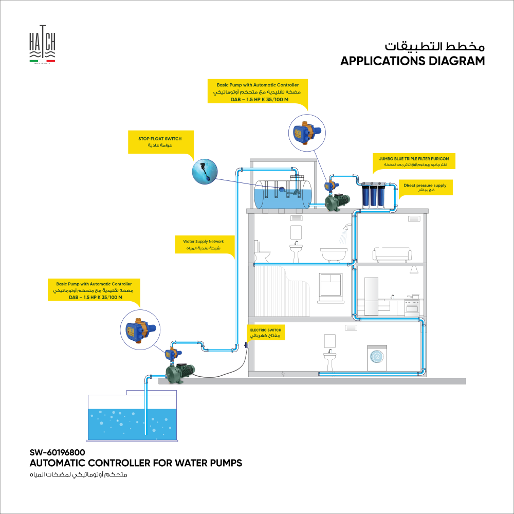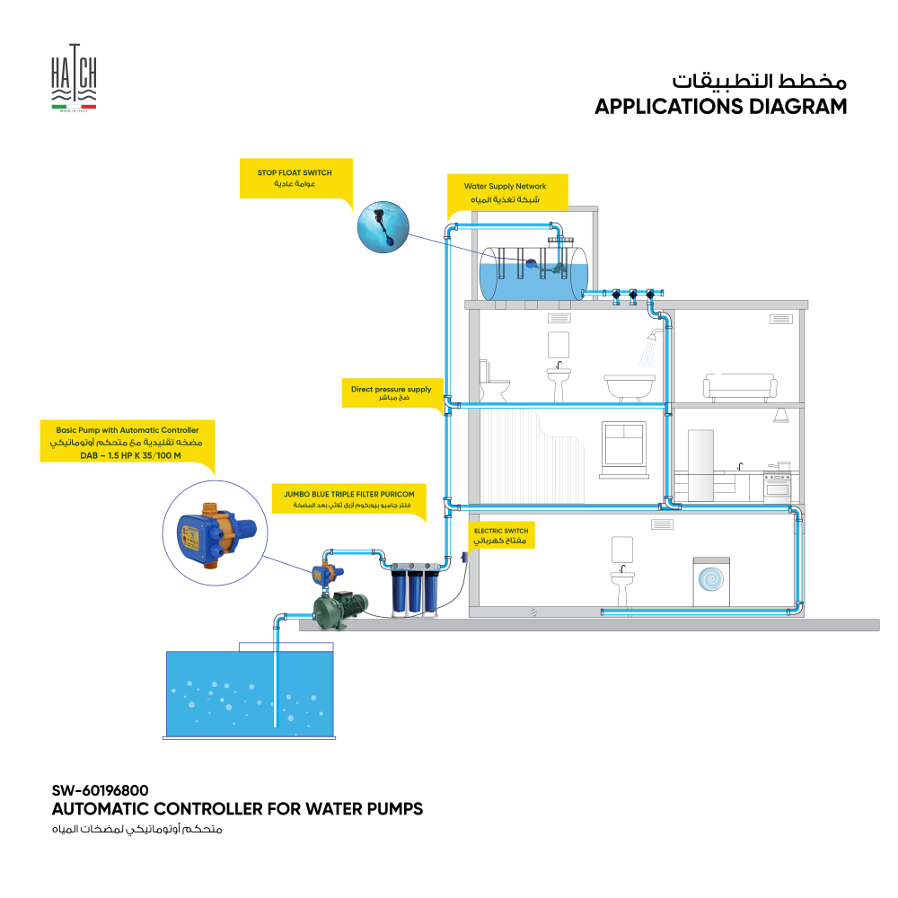 2. Make all electrical connections, check that the pump is properly configured, then open a tap to activate the device, from now on, the device will turn the pump on and off according to the opening and closing of the tap.