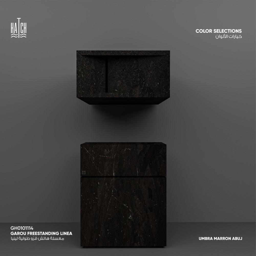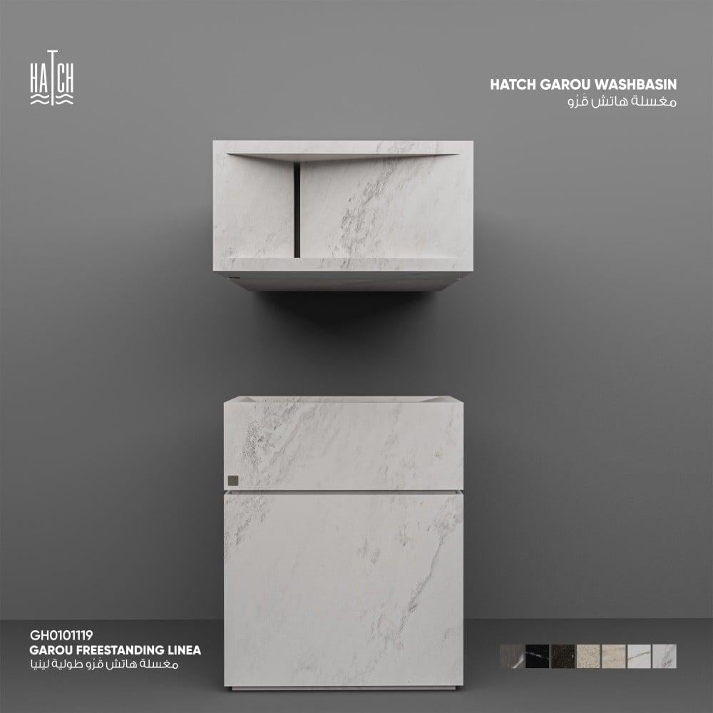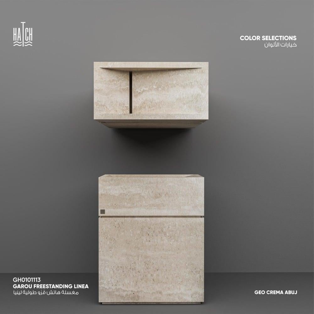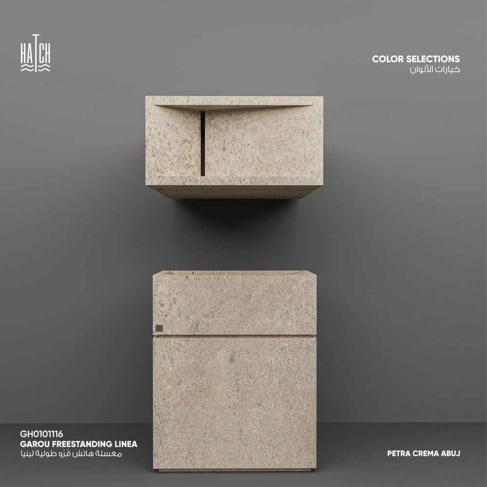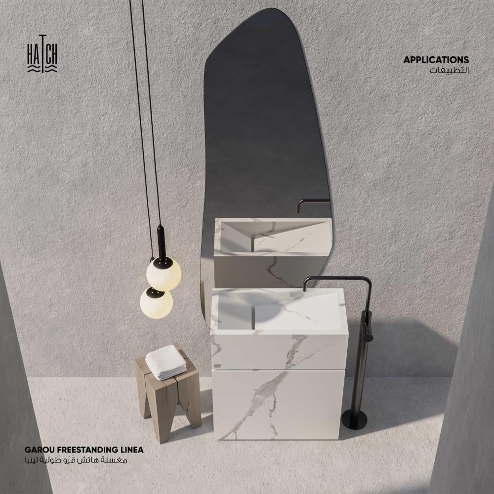 Product Description: Hatch Groo porcelain sinks with a modern, diverse design inspired by our Saudi heritage, describing the sink basin made of stone and clay as natural and local materials.