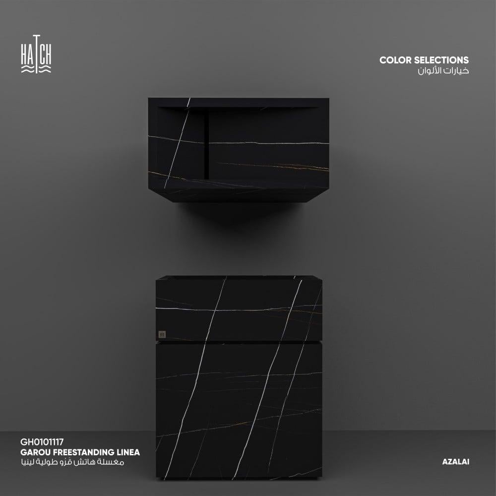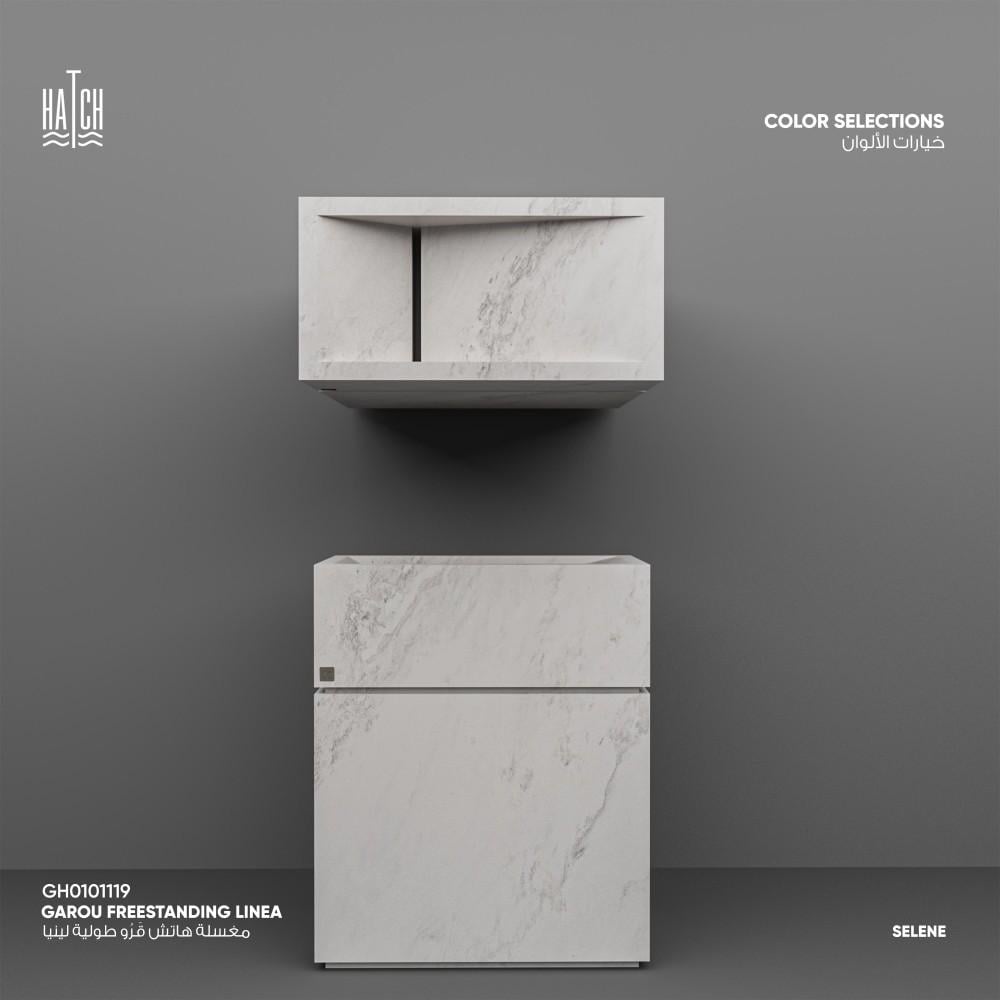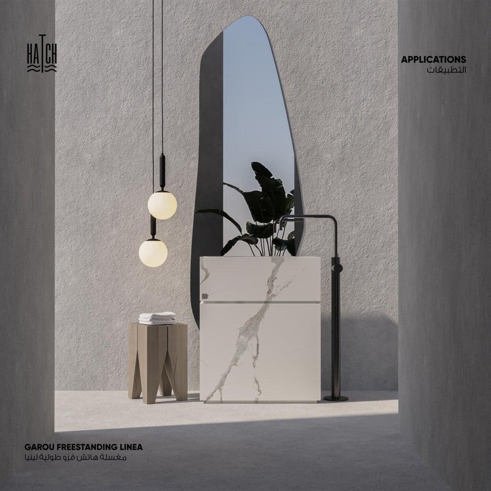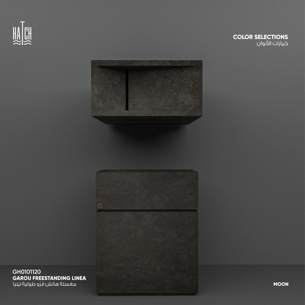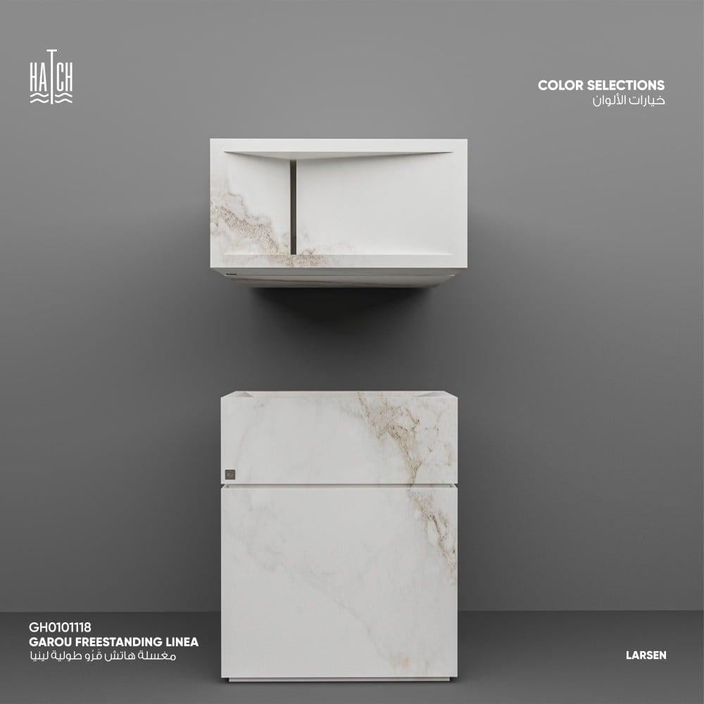 Product Description: Hatch Groo porcelain sinks with a modern, diverse design inspired by our Saudi heritage, describing the sink basin made of stone and clay as natural and local materials.