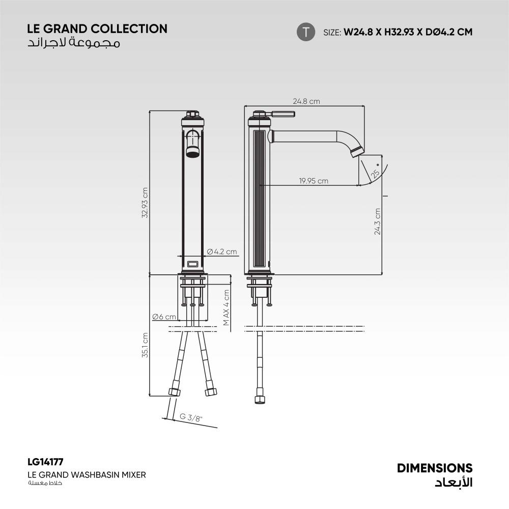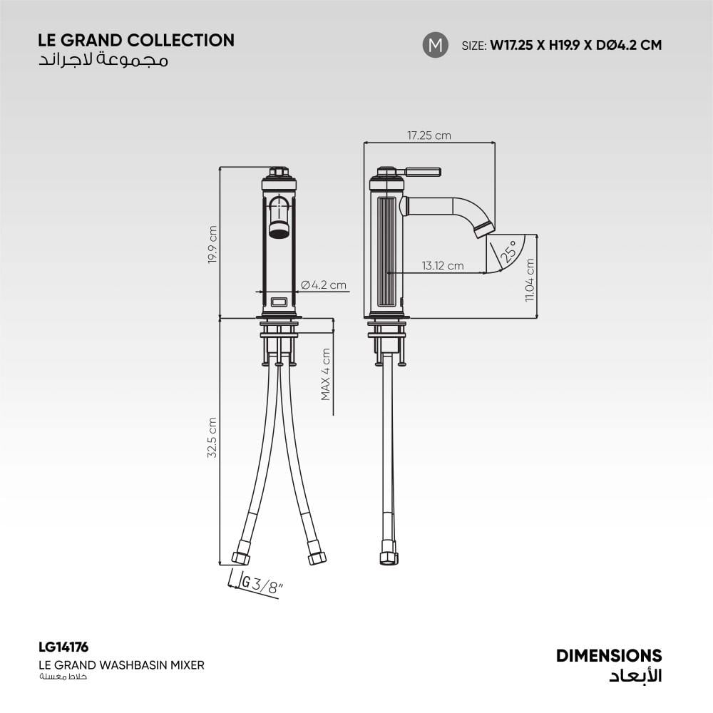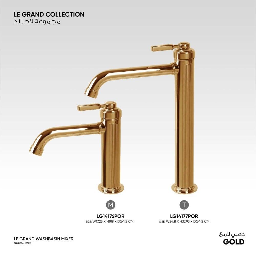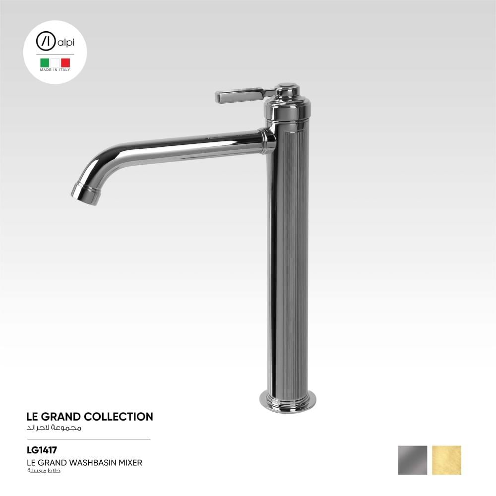 - Brass washbasin mixer with engraved hot/cold control lever.