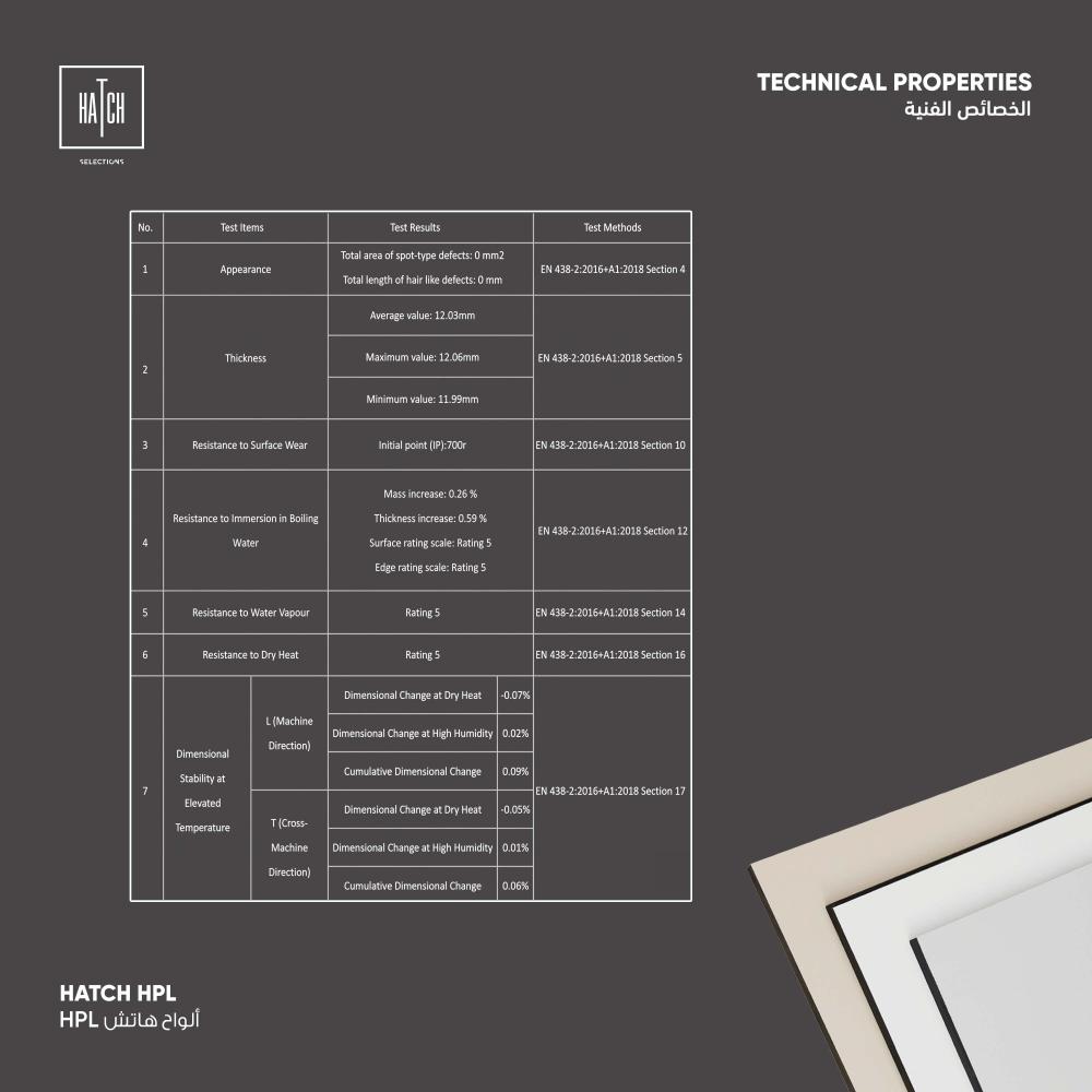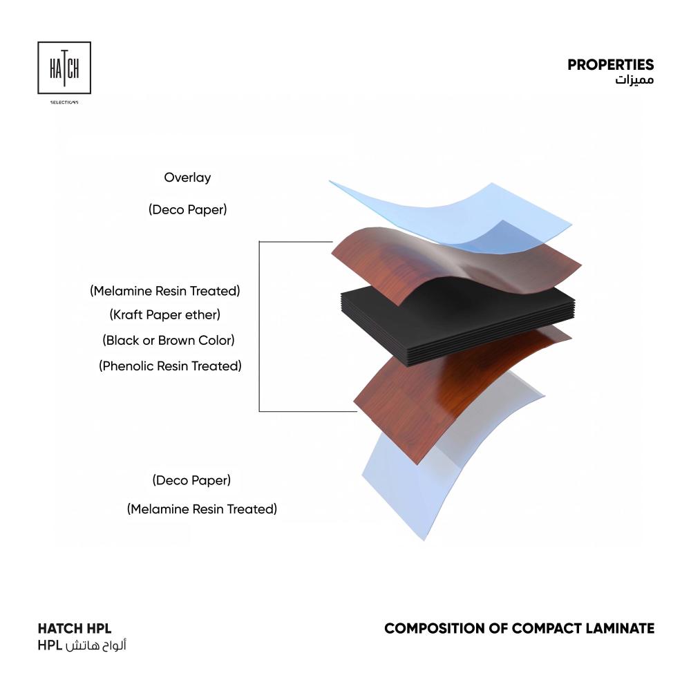 المادة​:رقائق مشبعة براتنجات الميلامين المضغوطة بالإضافة إلى طبقات متعددة من ورق الكرافت الأسود أو البني المشبع براتنج الفينول أو اليوريا فورمالدهيد